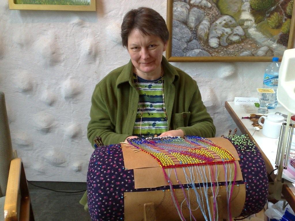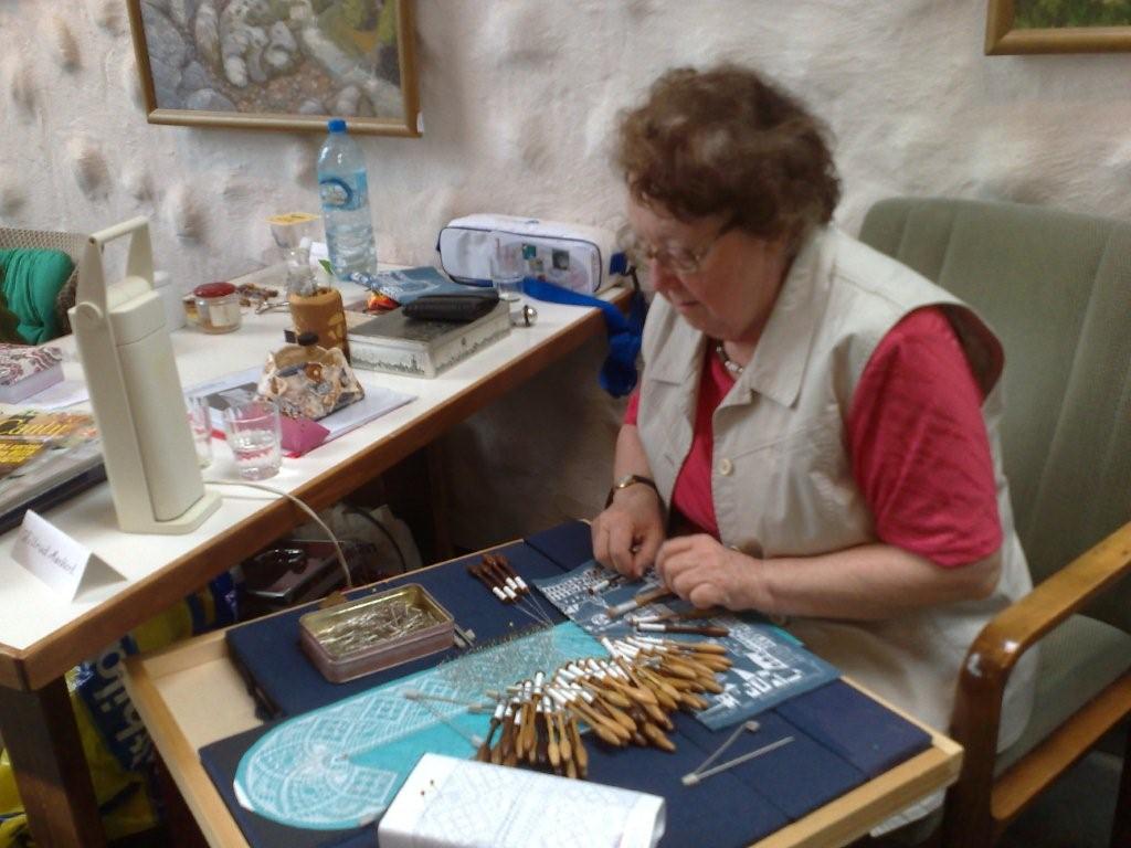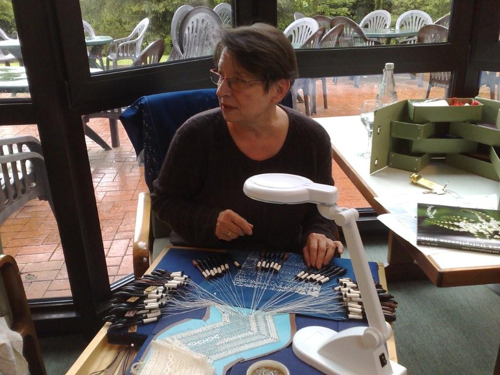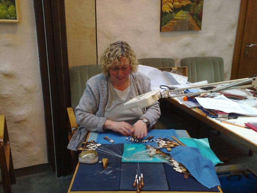 Hiltrud Markert klöppelt fast im Akkord ein Tischband in Torchon