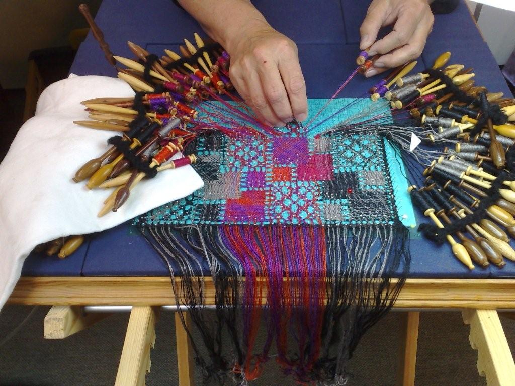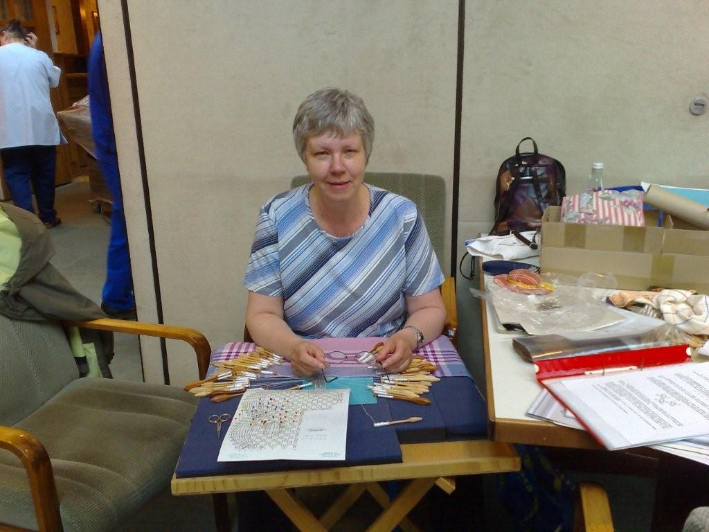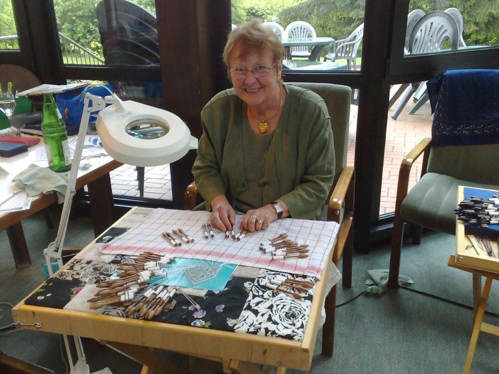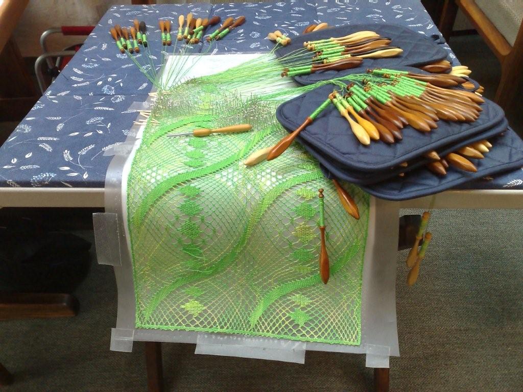 Hiltrud Markert klöppelt fast im Akkord ein Tischband in Torchon