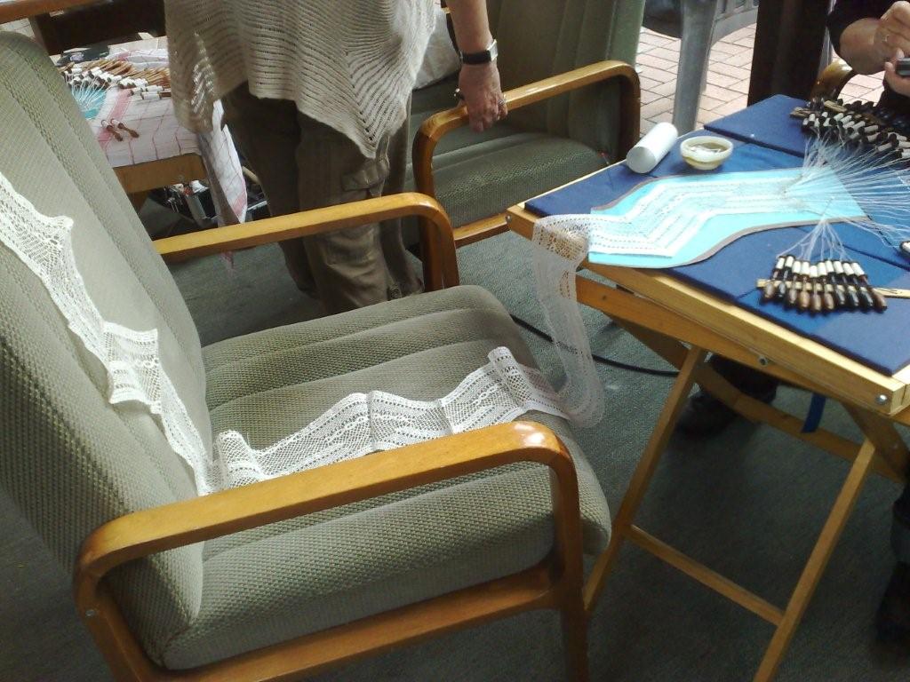 Angelika Becker-Kater hat einen schmalen Torchonschalt ( Entwurf Inge Teuerkauf)