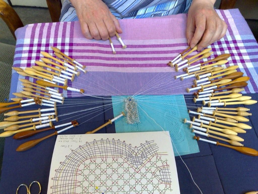 Sabine Schwiedering klöppelt eine feine Tüllspitze mit Konturfäden